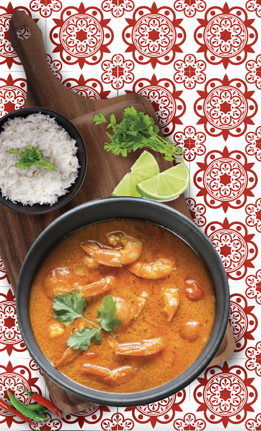 The flat lay style of photography with black bowls display the meals in the way they would be served, whilst showing the colours and ingredients clearly. The use of tiles as a printed background gives authenticity since detailed tiles are used throughout street eateries across the region.
